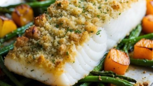Coat cod with avocado oil, parsley, thyme, turmeric, salt, and pepper.