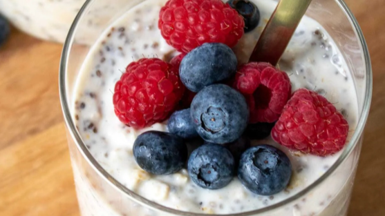 Mix in jar, refrigerate overnight. Add toppings before eating.